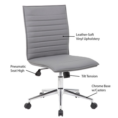 This armless task chair is designed with a look that brings any room or office to the next level. The chair features a gorgeous and strong chrome 25 inch base with 2 inch nylon dual wheel castors that adds that perfect pop of metallic color to any room. In addition to looking fantastic, the chair also features a spring tilt mechanism, a pneumatic gas lift for easy height adjustability, tilt tension and an upright lock, while also boasting a weight capacity of 275 lbs.